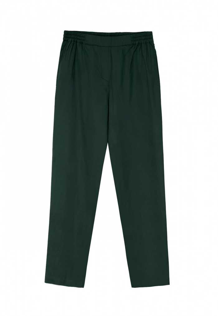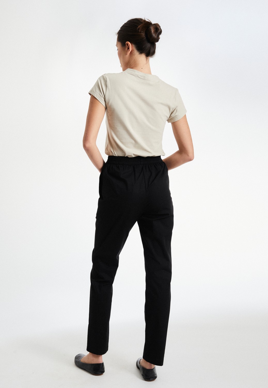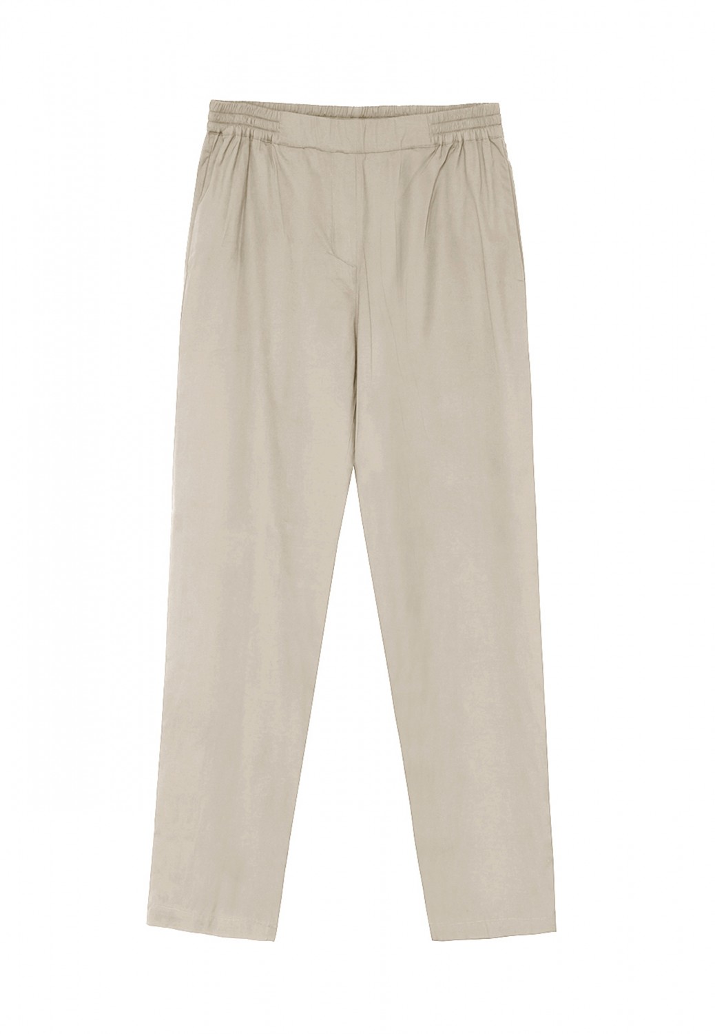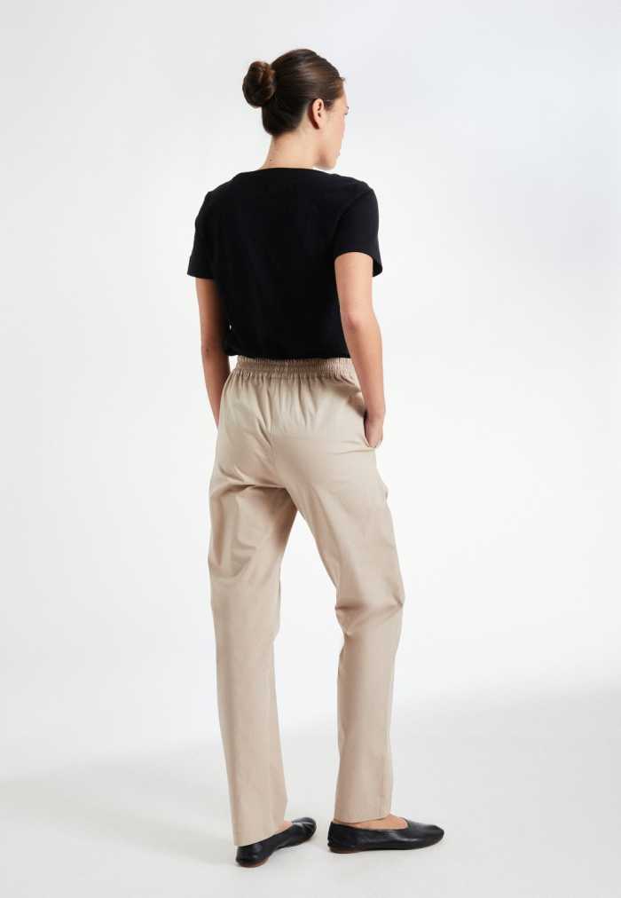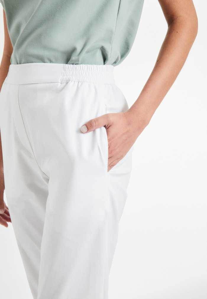 Straight-leg women’s pants featuring a smooth front waistband and elastic back.