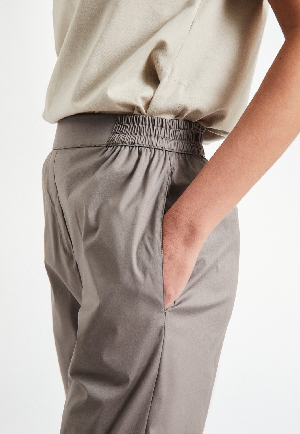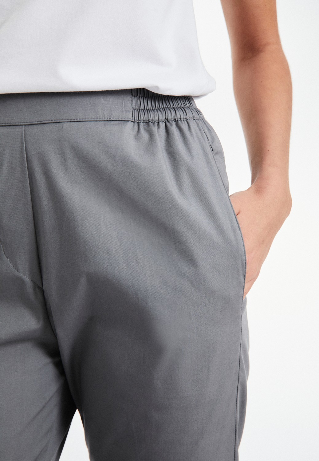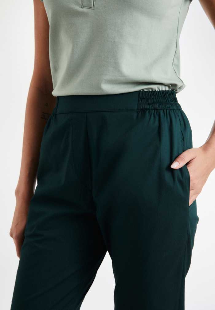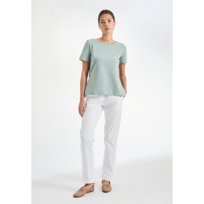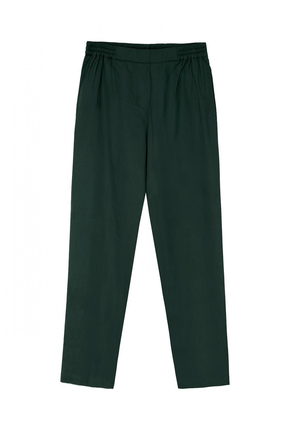 Straight-leg women’s pants featuring a smooth front waistband and elastic back.